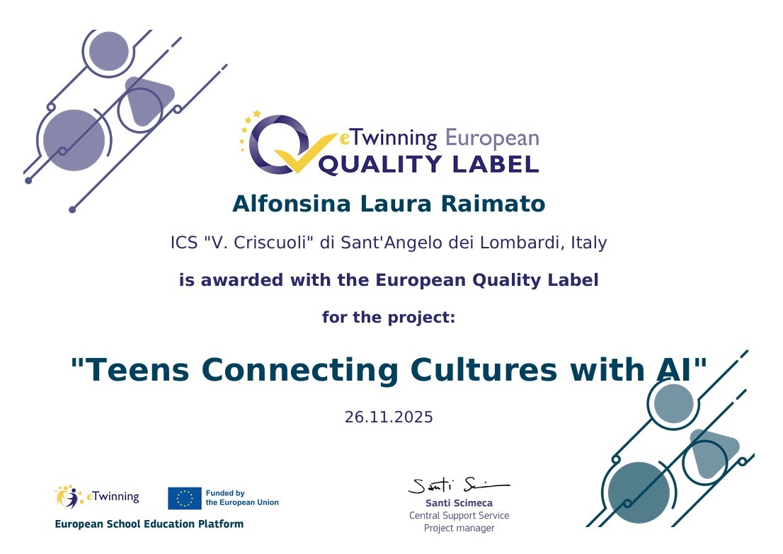 Il progetto eTwinning "Teens connecting cultures with AI", realizzato durante l'a.s. 2024/2025 dai Proff. Alba Cunzo, Elena Gugliucciello, Alfonsina Laura Raimato, Carlo Rescigno e Raffaele Mario Ventola in collaborazione con docenti e studenti di scuole situate in Giordania, Italia, Portogallo, Romania, Serbia e Turchia, ha ricevuto l'eTwinning National Quality Label, un riconoscimento nazionale che attesta il raggiungimento di un preciso standard di qualità del progetto didattico svolto in piattaforma ESEP. Al progetto hanno partecipato gli alunni delle classi IA, IIA e IIIA della Scuola Secondaria di I grado del plesso di Morra De Sanctis.
